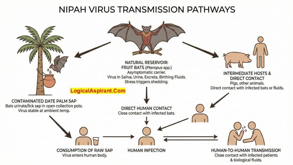- Transmission occurs through direct contact with infected bats, and sometimes through pigs acting as intermediate hosts.