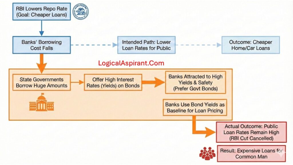 Imagine the RBI tries to make loans cheaper for people by lowering the cost at which banks borrow money (Repo Rate). Ideally, banks should pass this benefit to you by lowering interest rates on home or car loans. However, State Governments are simultaneously borrowing huge amounts of money, offer high interest rates (yields) on their bonds to attract lenders (Banks). Banks, looking for profit and safety, prefer to lend to the government at these high rates rather than lowering rates for the public. Since banks use these government bond rates as a baseline to decide their own loan prices, the high bond yields effectively cancel out the RBI’s rate cut, leaving the common man with expensive loans despite the RBI’s best efforts.
